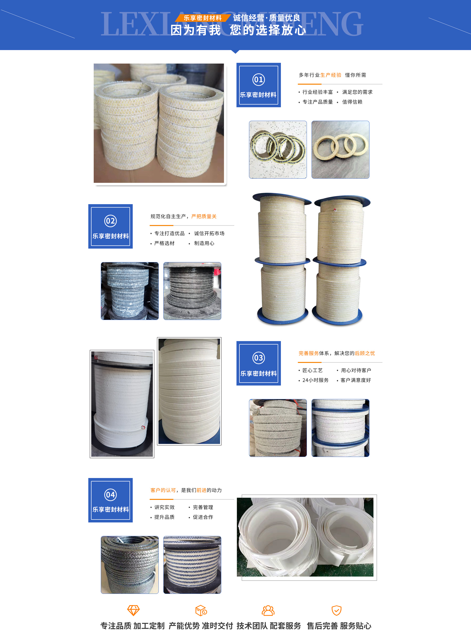 大城縣樂享密封材料有限公司主營:芳綸盤根,四氟盤根,碳素盤根,石棉盤根,芳綸墊片,石棉浸液盤根,芳綸盤根墊片,無油白四氟盤根,含油白四氟盤根,含油黑四氟盤根,石棉含油盤根,芳綸碳素盤根,石棉橡膠盤根,芳綸碳素混編盤根、聚四氟乙烯板(四氟板)等,是生產銷售密封件的廠家,廣泛應用于石油、化工、造紙、造船、發(fā)電、冶金等工業(yè)設備的管道、閥門、法蘭、換熱器等。